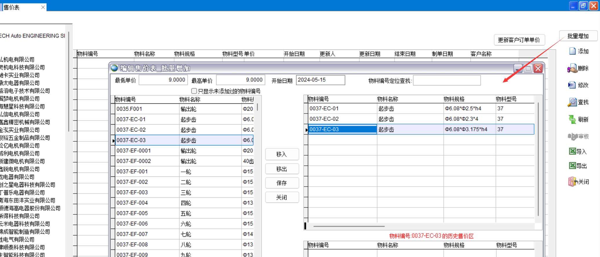 點添加,輸入物料編號、最低單價、最高單價、標準單價,點保存