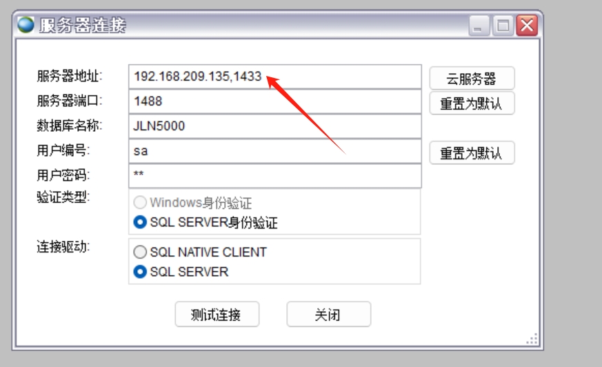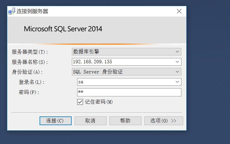 重新打開SQL管理器,用服務(wù)器名稱改為IP地址,身份驗(yàn)證改為SQL SERVER身份驗(yàn)證,使用管理員賬號(hào)登錄