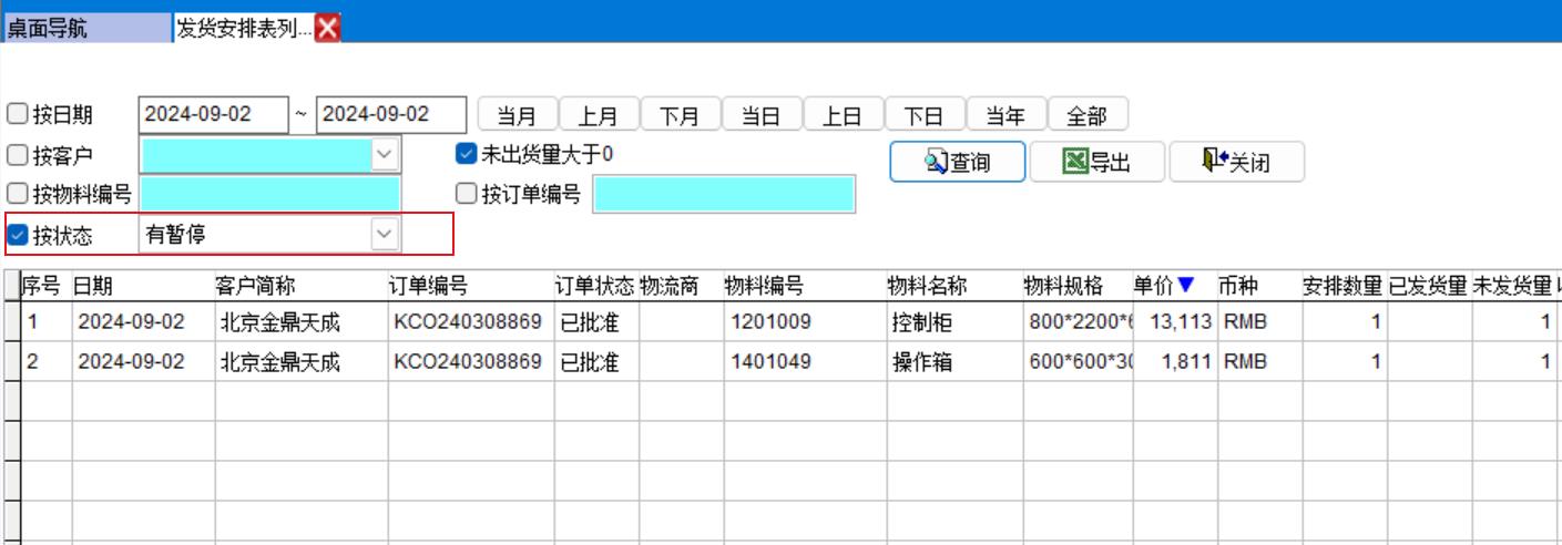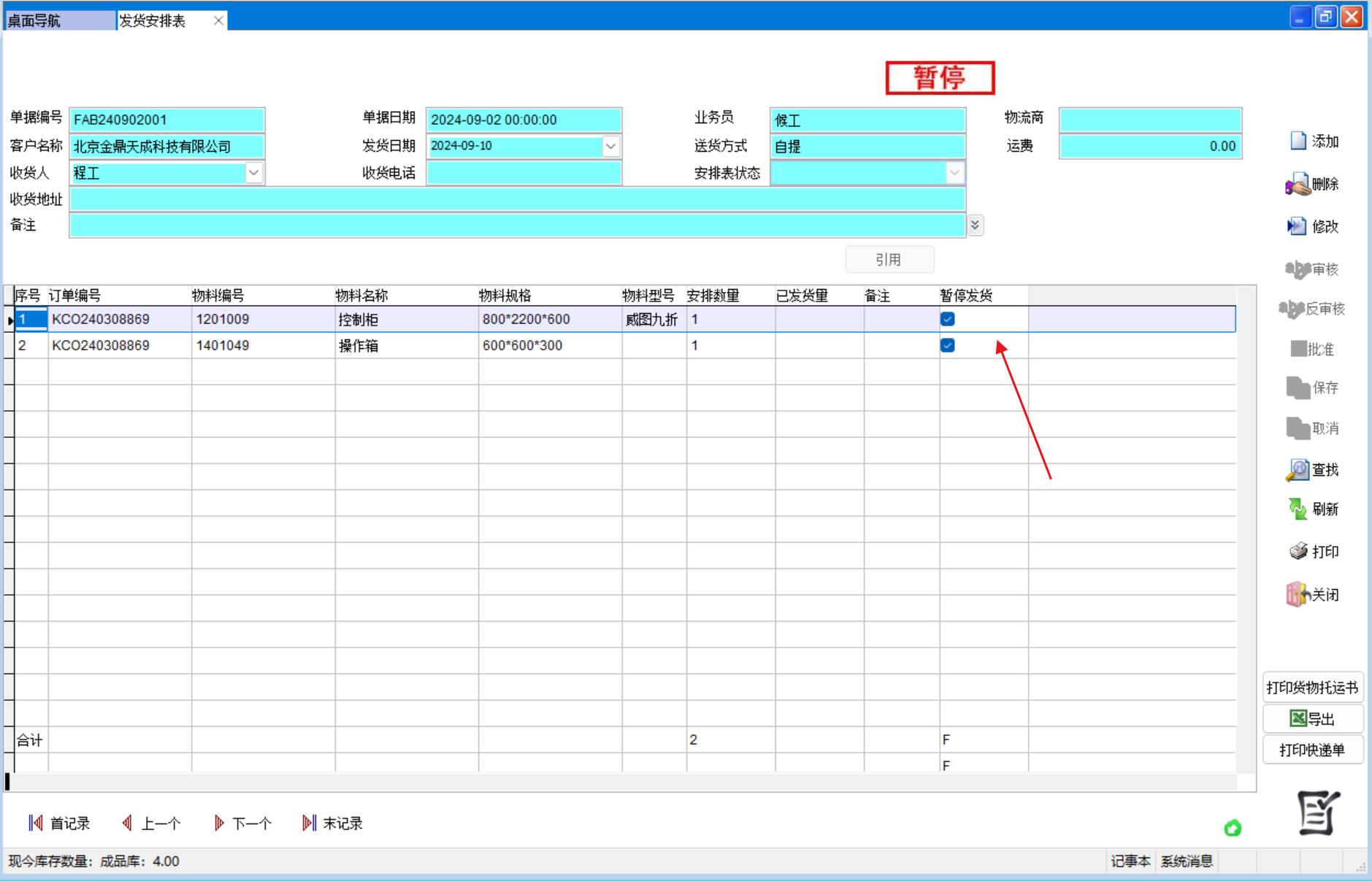 默認(rèn)暫停發(fā)貨是隱藏的,可以通過(guò)表體布局把暫停發(fā)貨顯示出來(lái)。