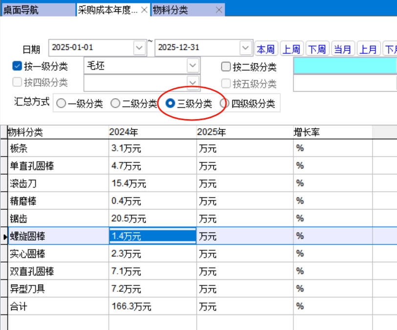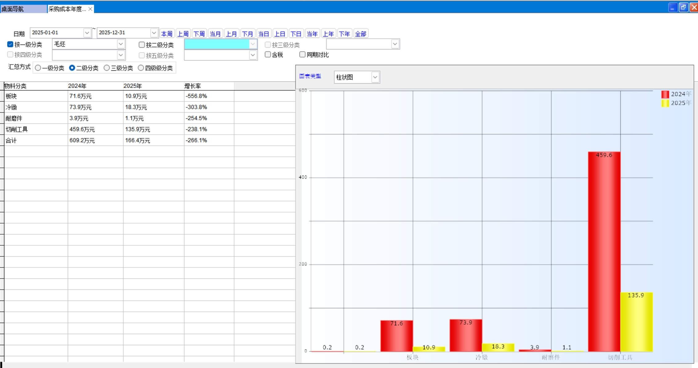統(tǒng)計數據來源于采購單,按物料的分類對比今年和去年的采購金額。