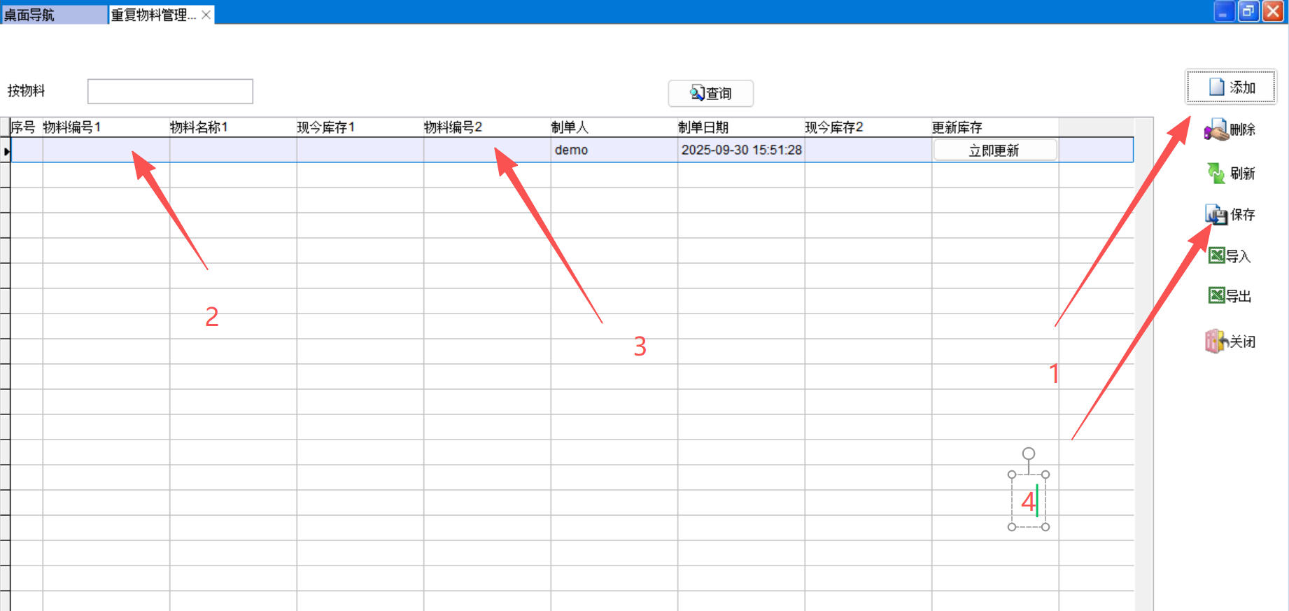 3、在物料編號2上直接輸入物料編號或雙擊選擇一個物料,物料編號2和物料編號1就是重復(fù)的物料