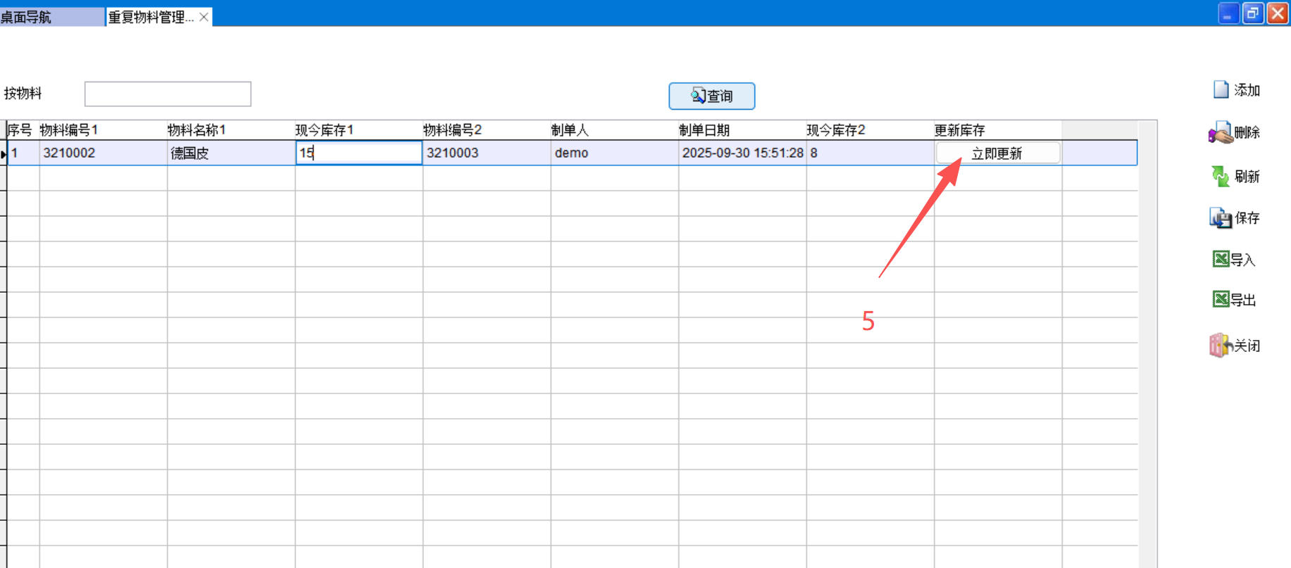 如上圖所示,3210002、3210003、3210004是同一個物料,名稱都相同,保存后在更新庫存上點立即更新,更新后3個物料的庫存就會保持一致,以后任意一個物料的出入庫后,其他兩個物料也會同步庫存量。3個物料會始終保持庫存一致。