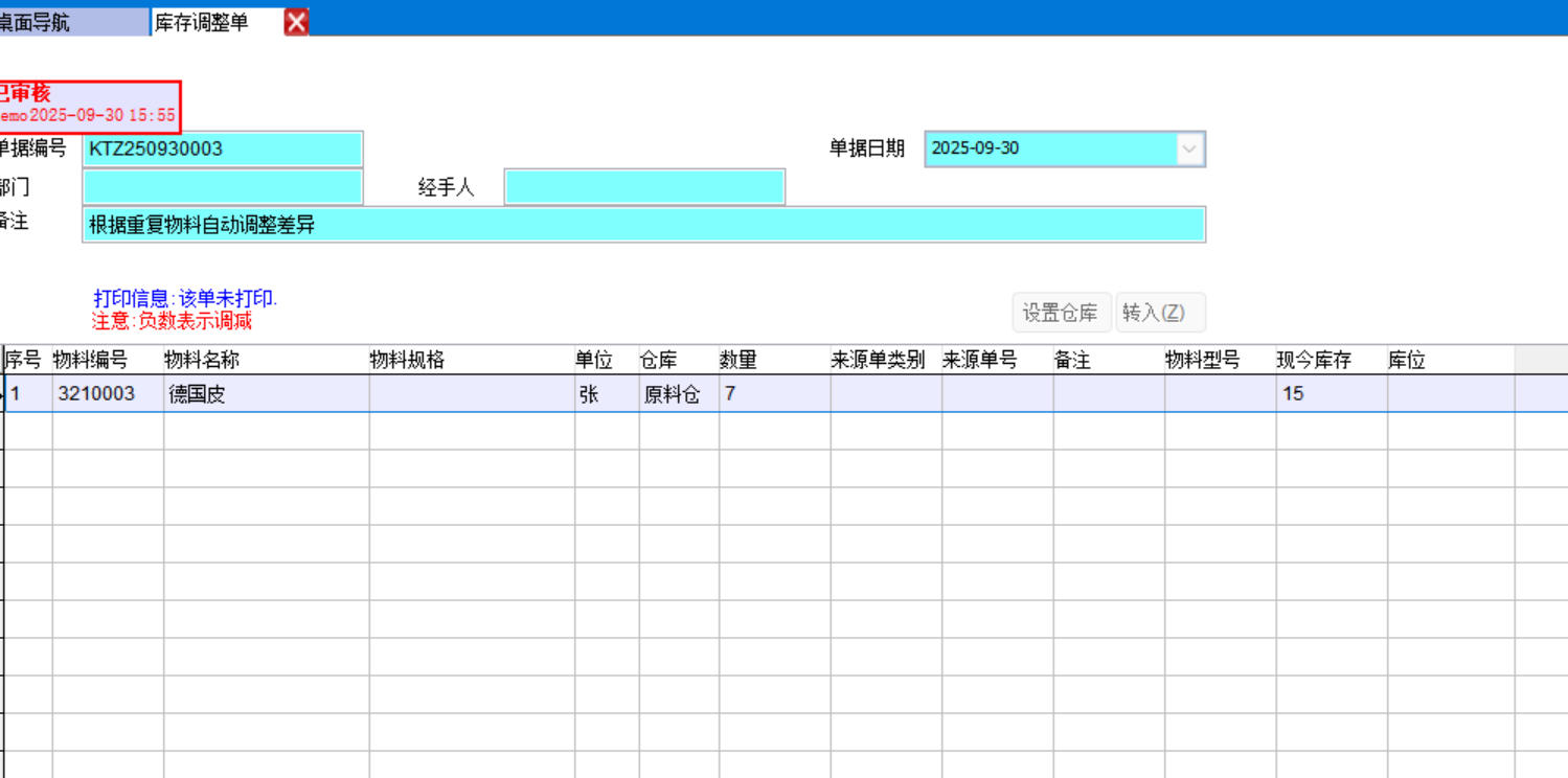 點立即更新后系統(tǒng)會自動生成一個庫存調(diào)整單,將物料編號2的庫存數(shù)量調(diào)整和物料編號1一致。