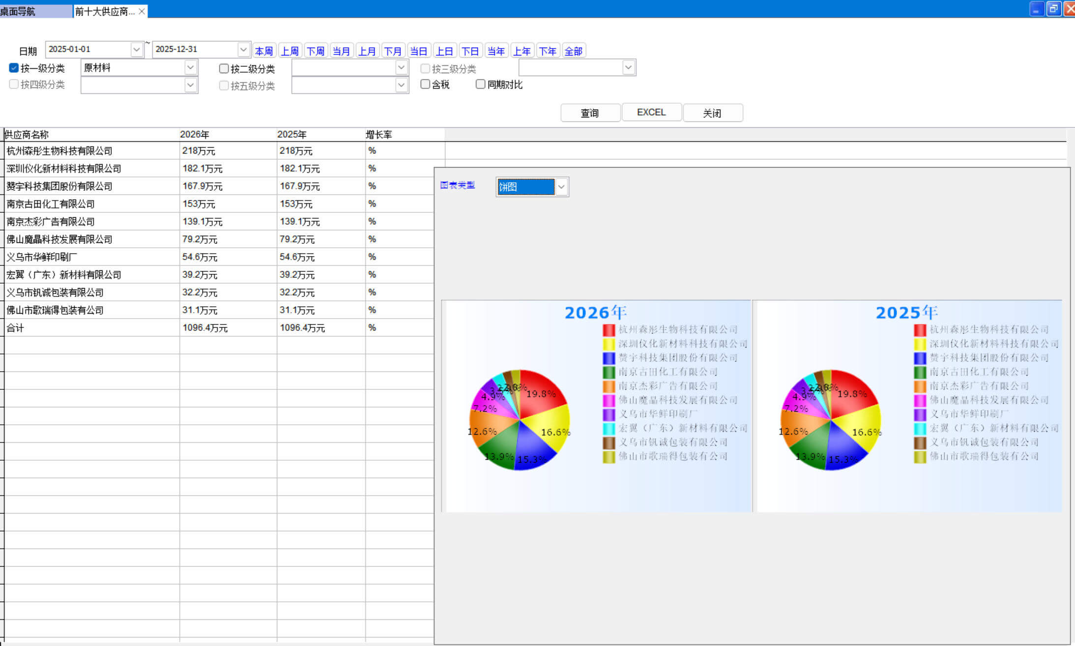 前十大供應(yīng)商是統(tǒng)計當(dāng)前和上年采購訂單金額前十大的對比統(tǒng)計表