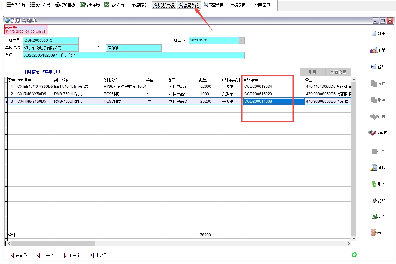 打開任一單據(jù),如下圖的采購入庫單,點(diǎn)擊上查單據(jù)可看到此采購入庫單來源于采購單