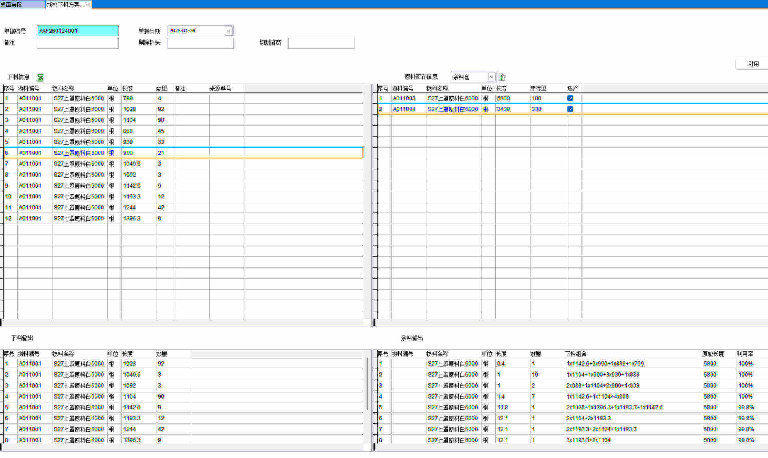 線材下料方案是機加工行業(yè)常用的下料優(yōu)化軟件,對線材、型材、鋼管、卡紙計算最佳下料組合,市面上的下料優(yōu)化軟件都是單機版的,本功能是將下料優(yōu)化軟件整合到ERP中使用。
