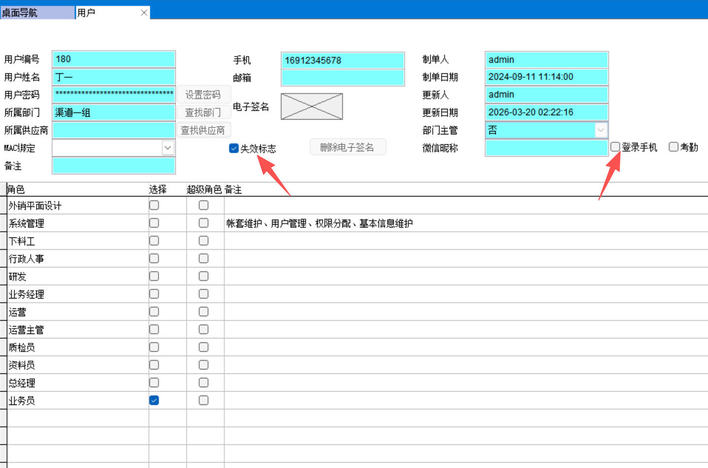 所以如果還想能夠按失效的業(yè)務員查看銷售信息,在業(yè)務員設置中可以不點失效,只要在用戶中點失效就行了。即能夠防止該賬號登錄又能夠讓其他人員能按該業(yè)務員查詢一些信息