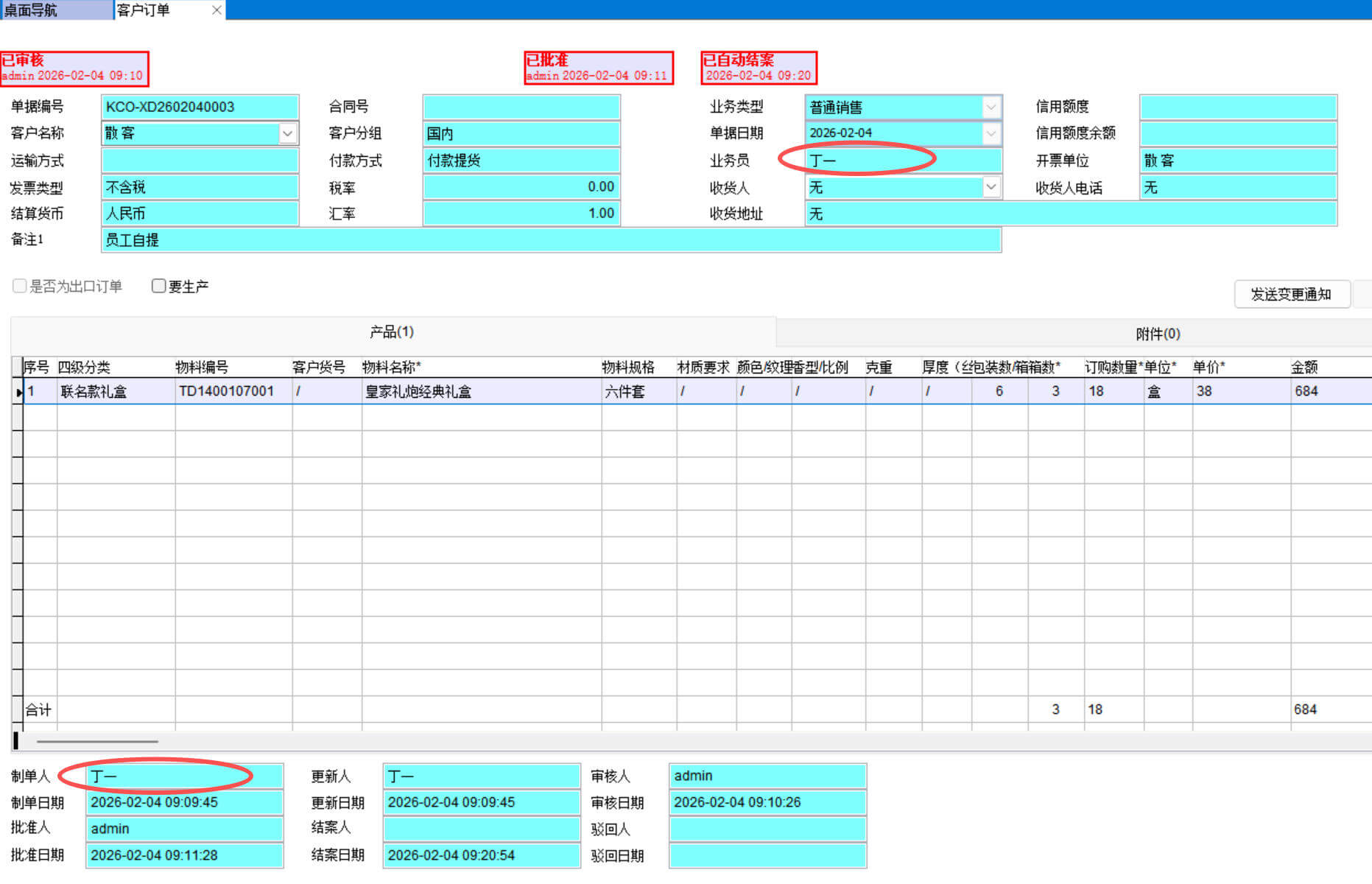 比如這個訂單是業(yè)務員丁一的
