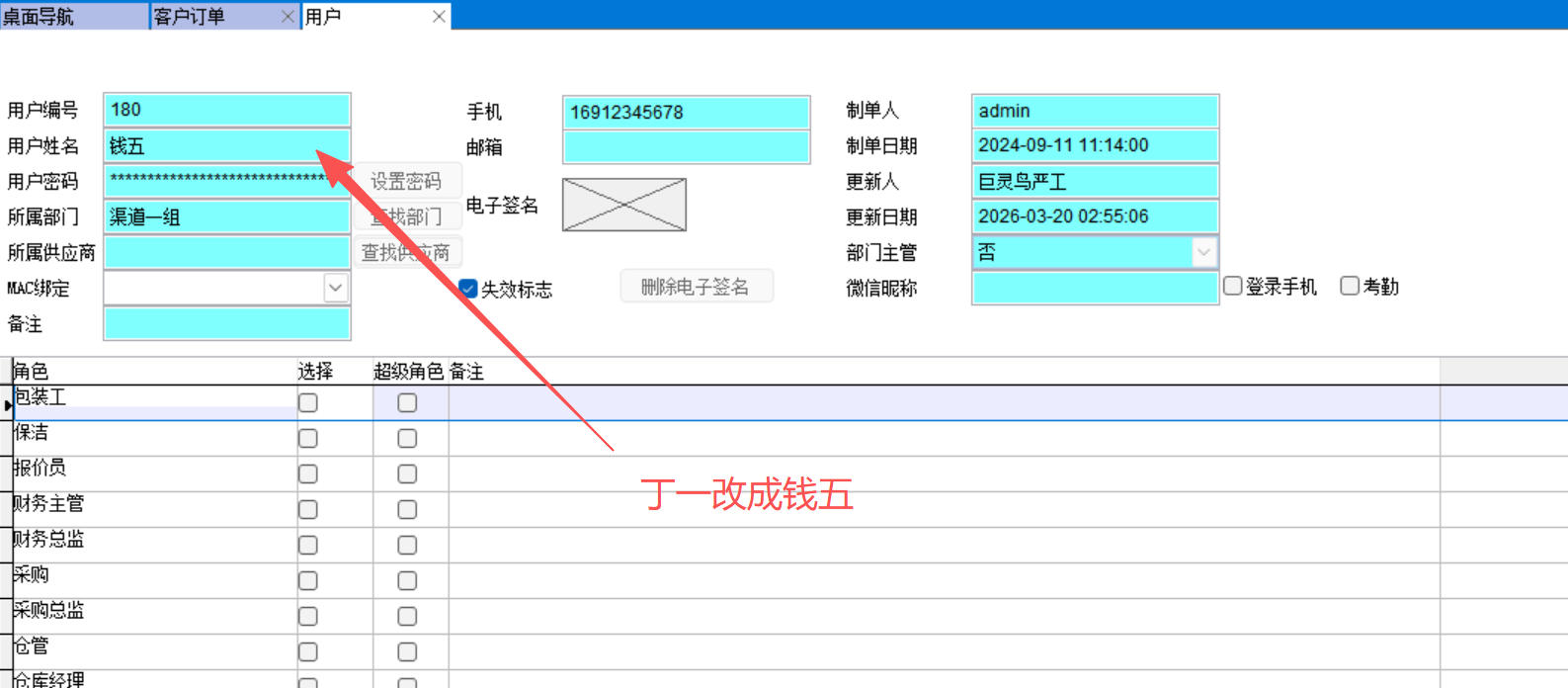 現(xiàn)在丁一離職了,直接用戶改成錢五