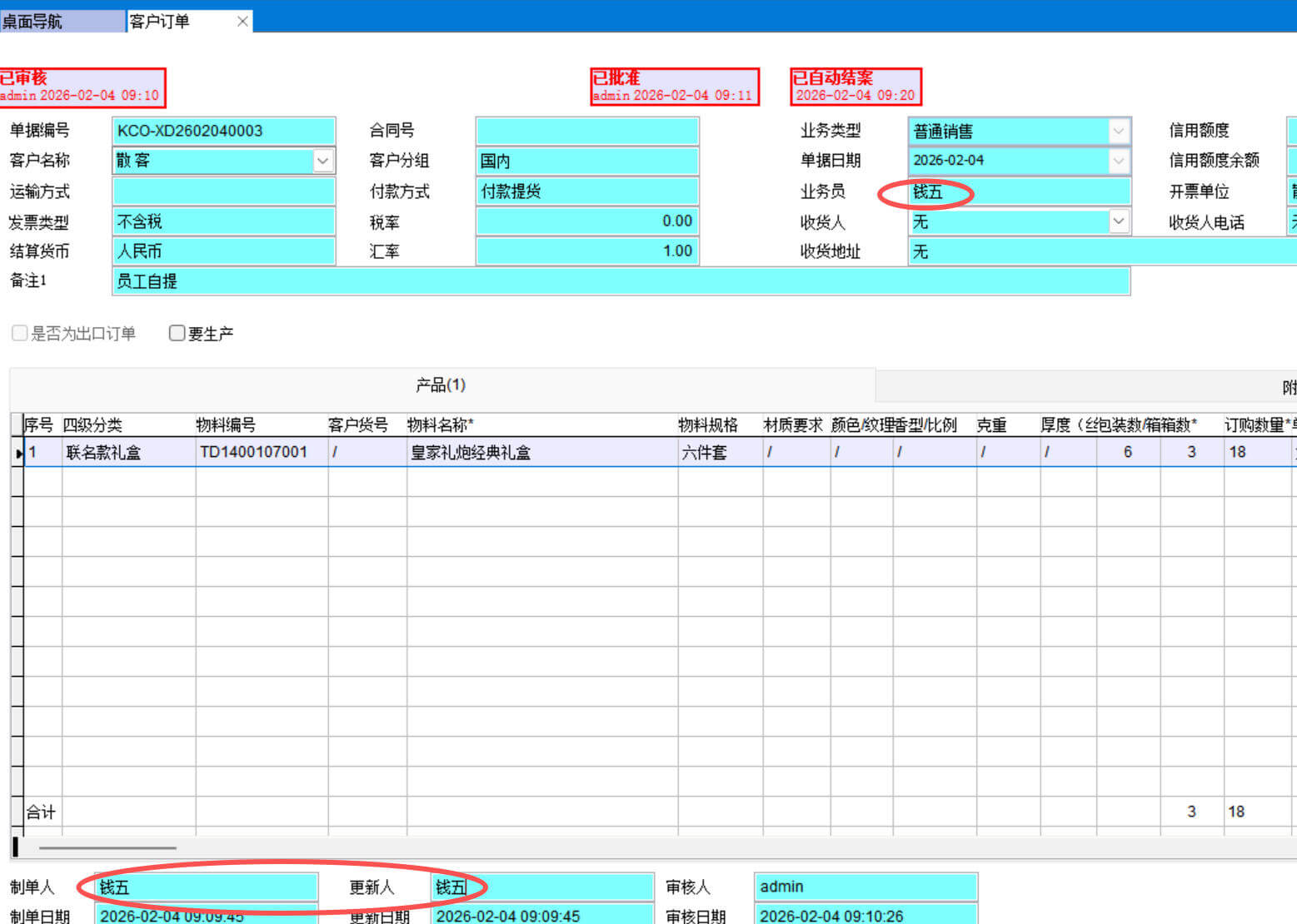 這時已經沒有丁一的任何痕跡了,我們無法判斷這個訂單是新來的錢五做的還是以前的丁一做的,如果誰做的單不重要就可以這樣操作。