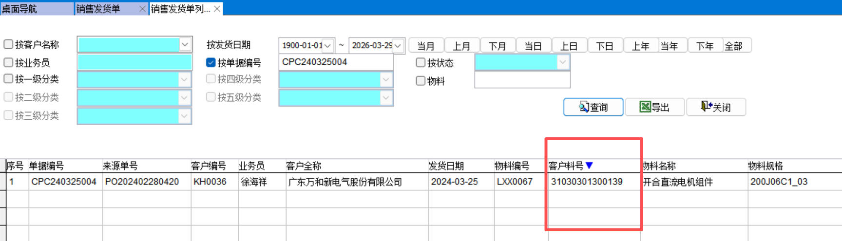 銷售發(fā)貨單中的自由項(xiàng)也可以在銷售發(fā)貨單列表中顯示,比如下圖的客戶料號(hào)