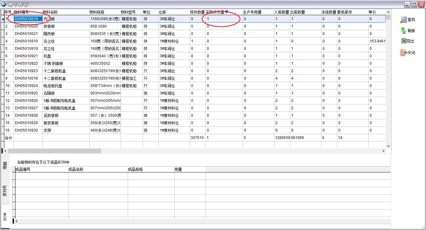 成品BOM 點(diǎn)擊某行物料可以看到該物料在哪些BOM中存在 直接顯示庫存信息 在配置文件中勾選現(xiàn)今庫存打開直接顯示庫存信息后,打開現(xiàn)今庫存就直接按默認(rèn)查詢條件顯示庫存信息,否則只有點(diǎn)查找后才會有庫存信息