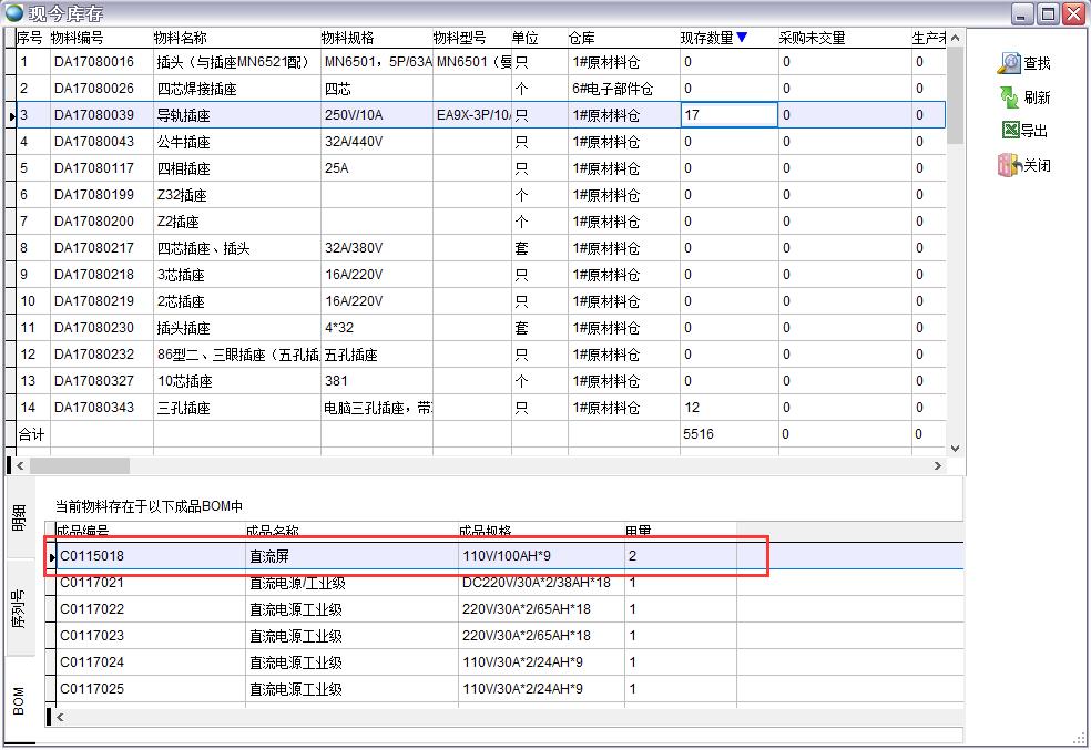 查詢出所有物料名稱中包含插座的物料,如果需要完全匹配可以勾選精確匹配