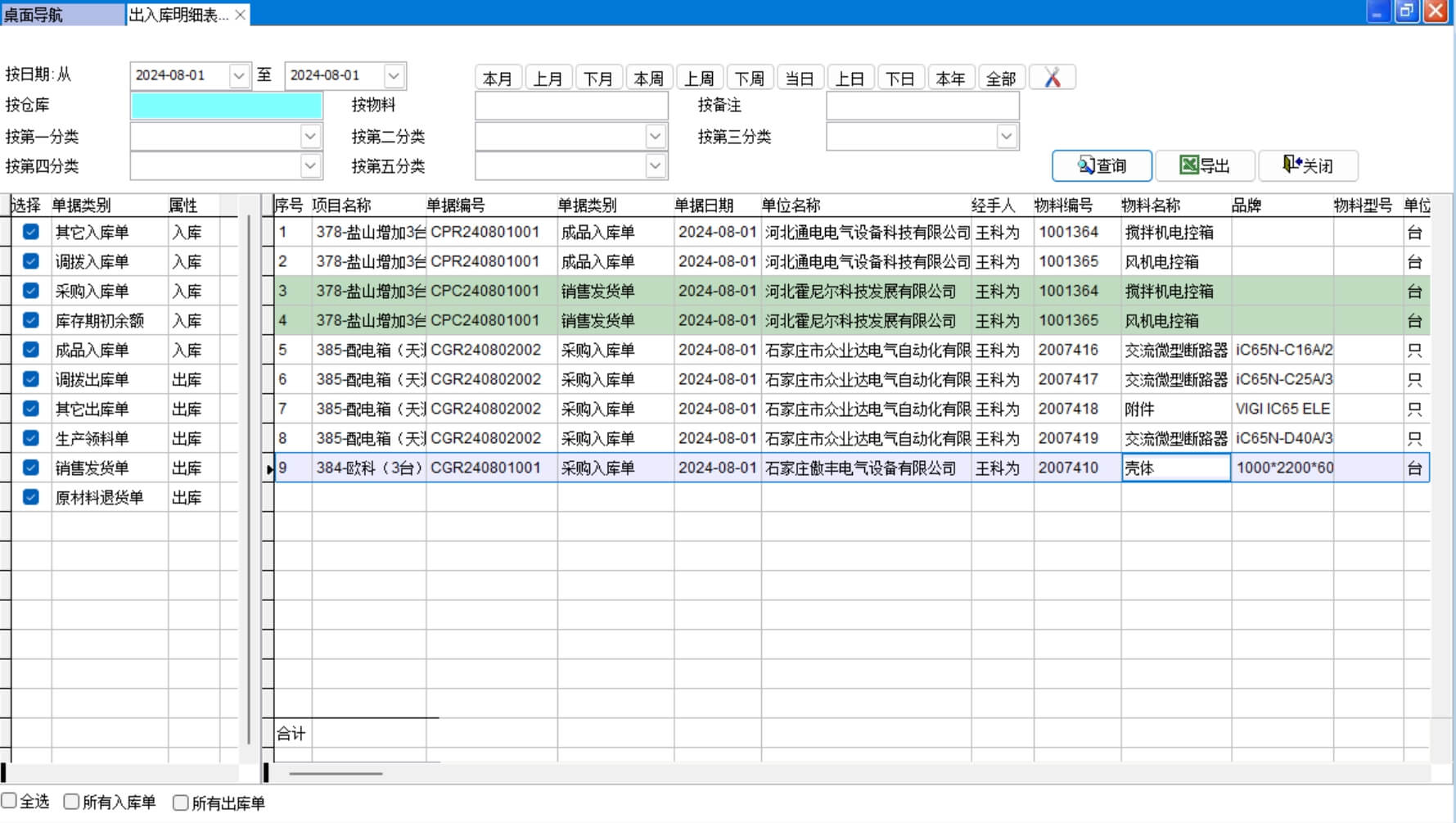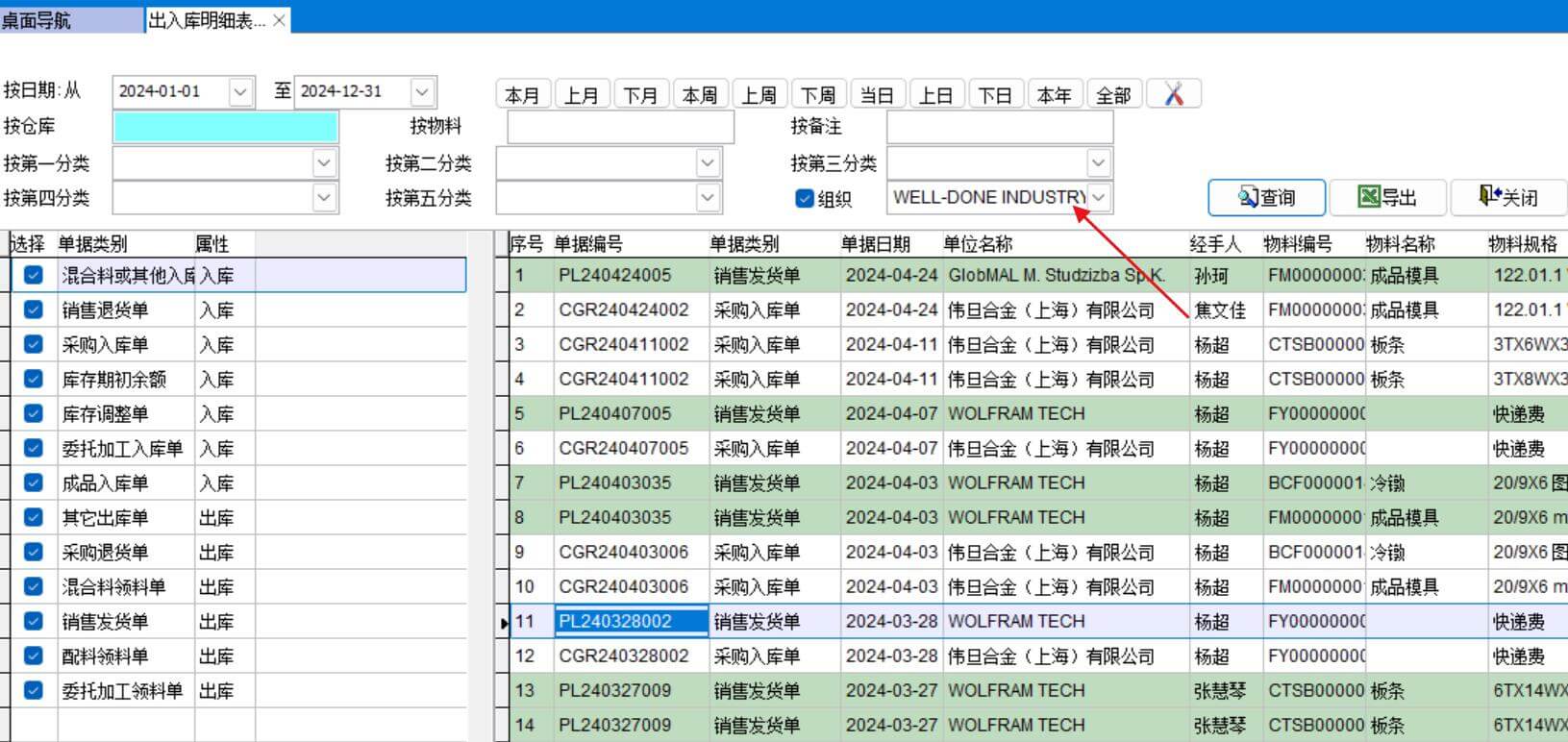 表格中白色是入庫(kù)單記錄,綠色是出庫(kù)單記錄