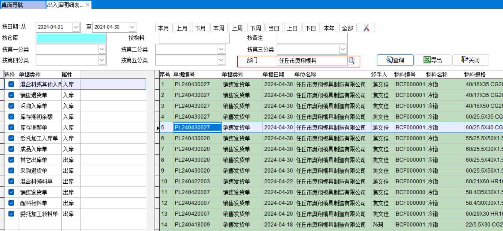 可以按物料分類、單據(jù)類別、倉(cāng)庫(kù)、物料、單據(jù)日期進(jìn)行查詢
