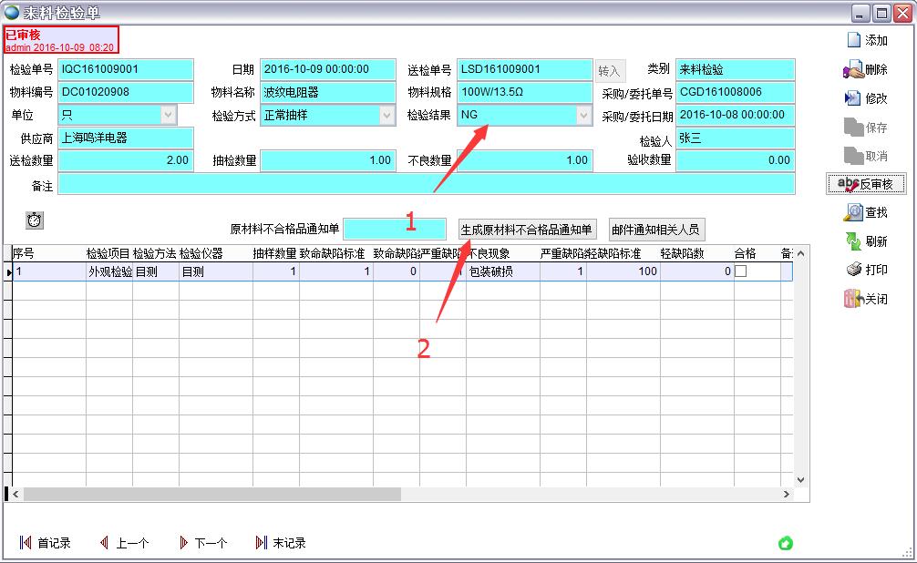 當(dāng)來料檢驗單判定的檢驗結(jié)果是不合格的前提下,可以點擊生成原材料不合格品通知單。