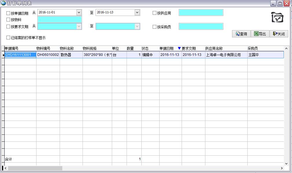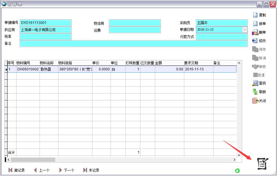 打開路徑:【主菜單】->【采購】-> 【打樣單】->點右下角