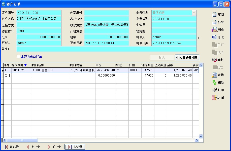 單價(jià)的小數(shù)位通常保留4~8位,在本系統(tǒng)中所有的單價(jià)默認(rèn)都保留4位小數(shù),保留4位以上小數(shù)位的目的是為了單價(jià)乘以數(shù)量后得到的金額能精確到分(小數(shù)2位)。以客戶訂單為例: