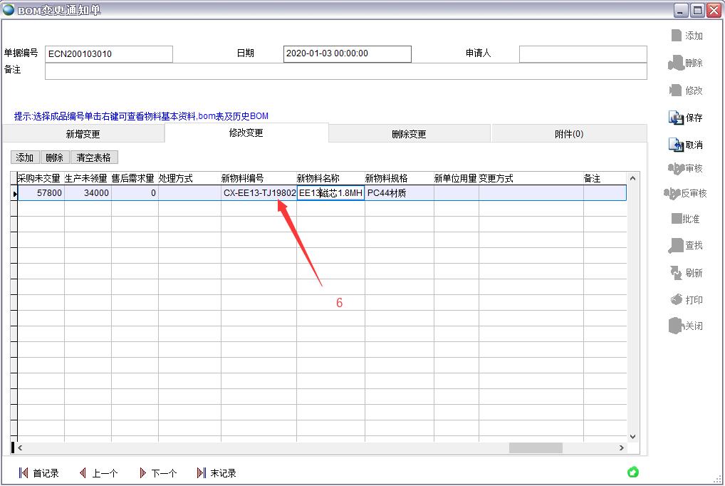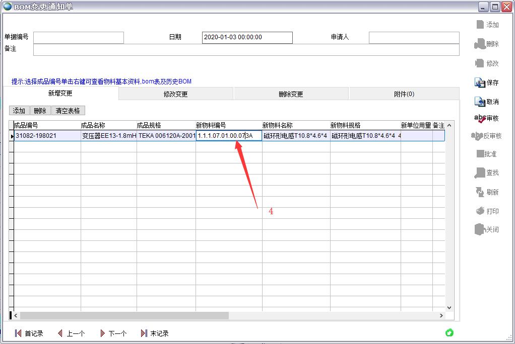 打開路徑:【主菜單】->【技術】->【BOM】->【BOM變更通知單】
