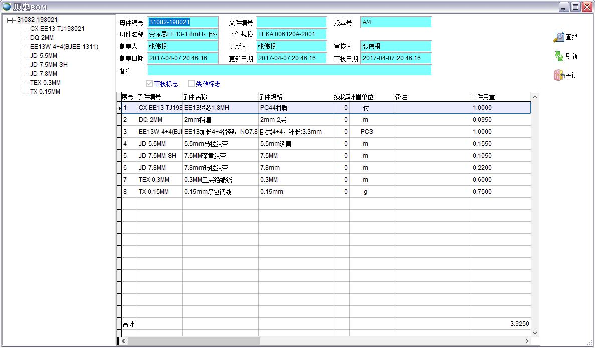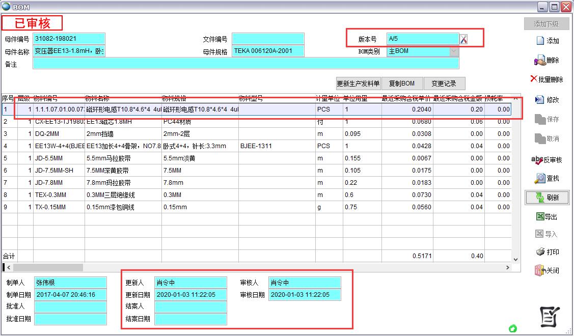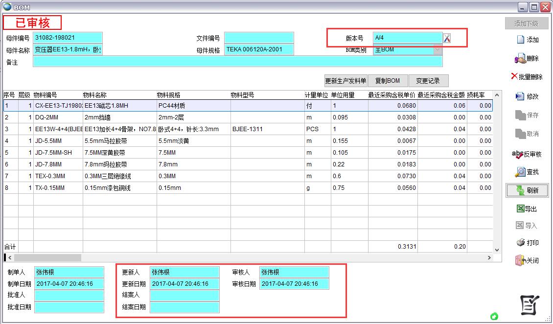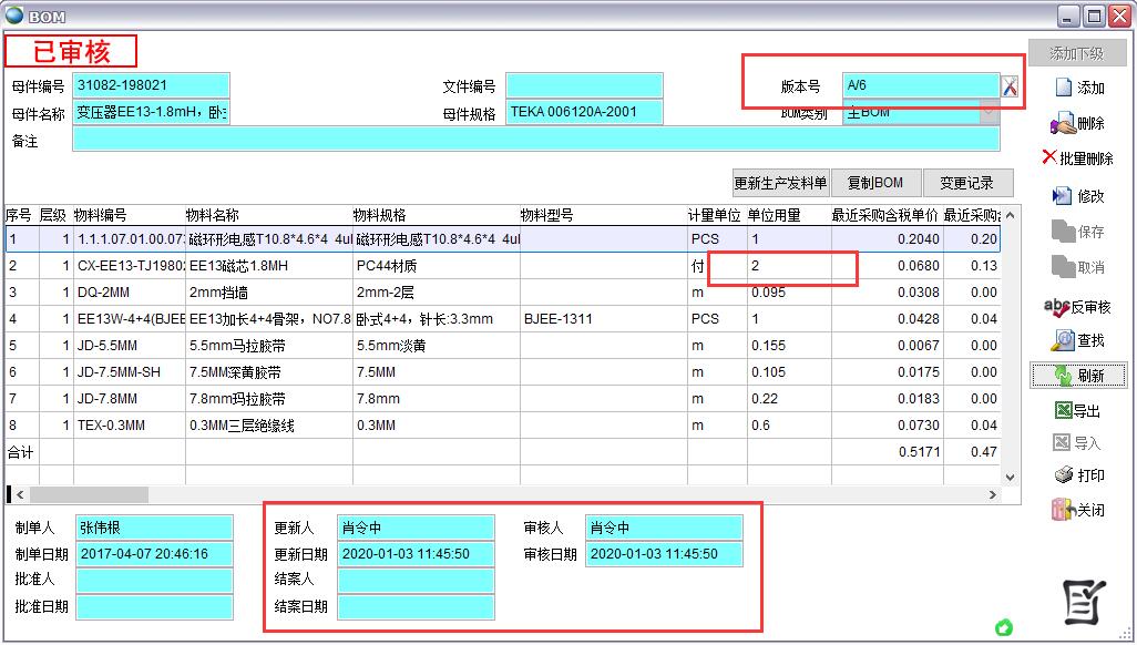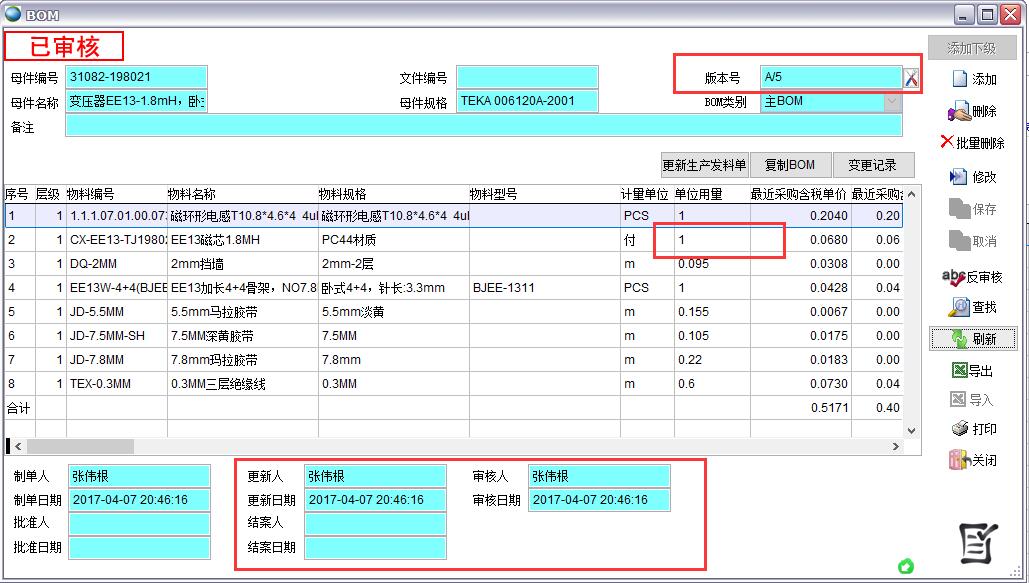 3、如果BOM為審核狀態(tài)則審核人、審核日期發(fā)生變化