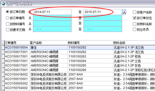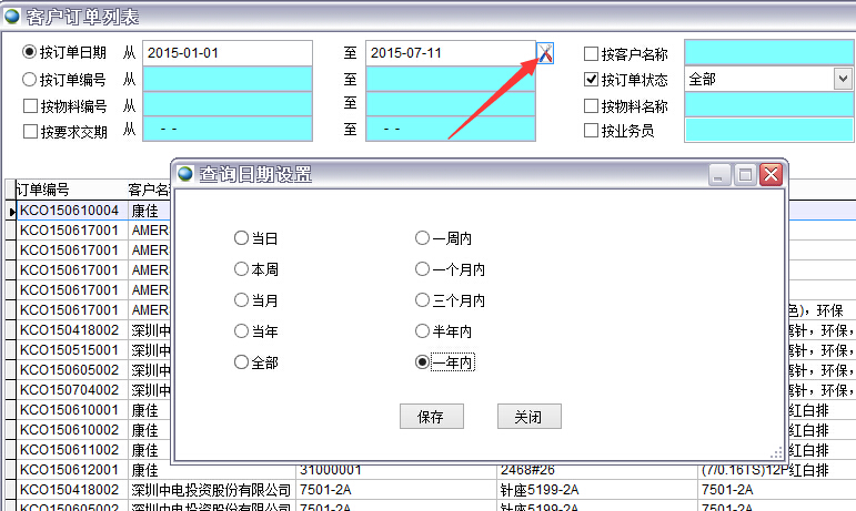 在訂單日期上單擊后出現(xiàn)查詢?nèi)掌谠O(shè)置按鈕,在點(diǎn)擊查詢?nèi)掌谠O(shè)置按鈕進(jìn)行設(shè)置