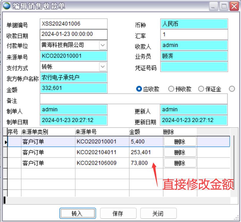 銷售收款單必須引用來(lái)源單據(jù),比如訂單金額1萬(wàn),現(xiàn)在預(yù)收50%,就引用客戶訂單做銷售收款單,這樣才能知道該訂單已經(jīng)收了50%了,還有50%未收。