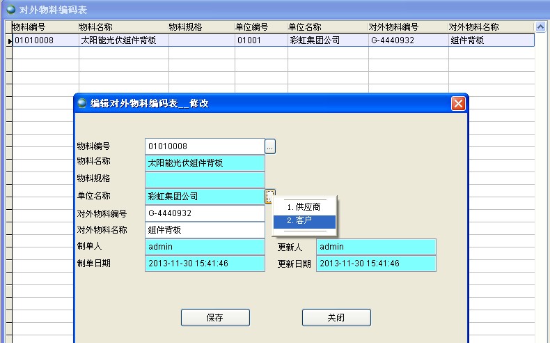 單位名稱可以是客戶也可以是供應(yīng)商,如上圖我們選擇的是客戶,則在客戶資料表中當選擇此客戶和該物料時可以看到對外物料編號和名稱。